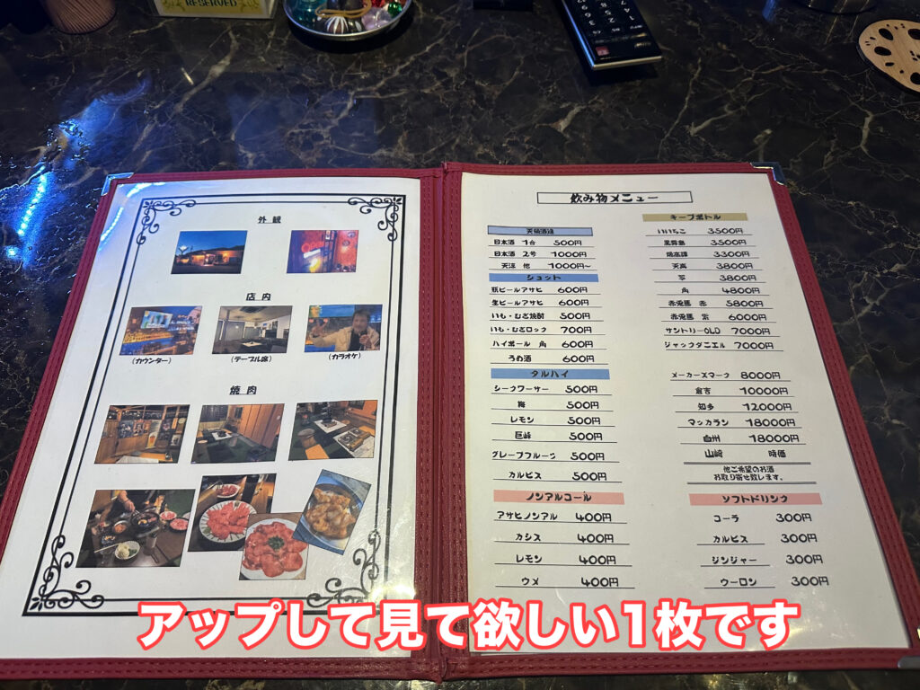 みなさんに、こちらの画像が拡大表示できれば、是非ご覧になっていただきたい写真の1枚なんですが、僕は居酒屋?BAR?それともスナック?とメニュー表の充実っぷりを受け、頭が軽くパニくってましたね。